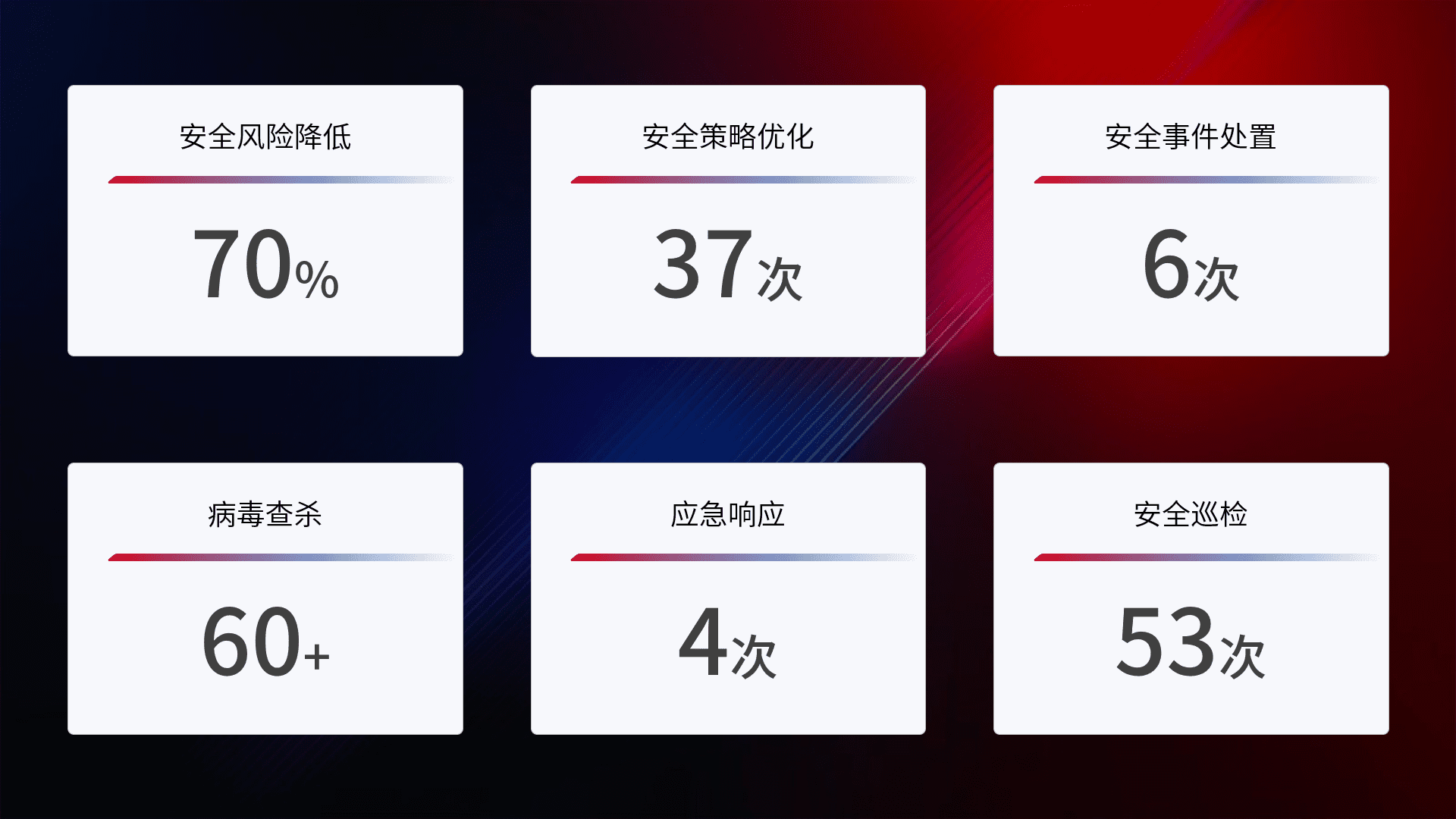 提供全面的安全事件报告体系,,,包括处置报告、、、周报、、、季度和年度总结,,,,结合持续监控,,,,帮助客户深入了解网络安全状况。。